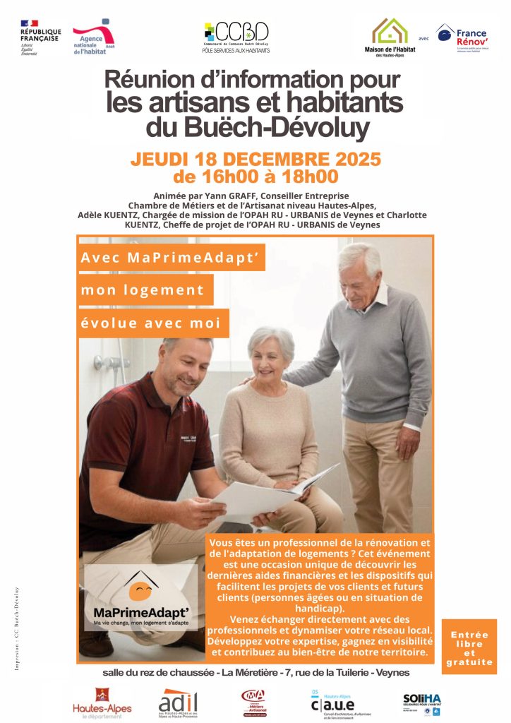 Affiche d’une Réunion d’information pour le dispositif Ma Prime Adapt’ Jeudi 18 décembre de 16h…
