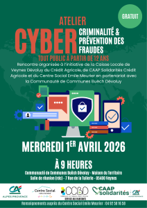 Une conférence / atelier ” Cyber criminalité et prévention des fraudes” sera organisée à Veynes le mercredi 01 avril 2026 à 9 heures.